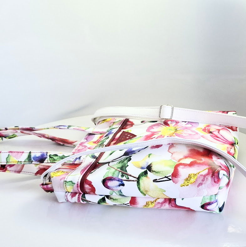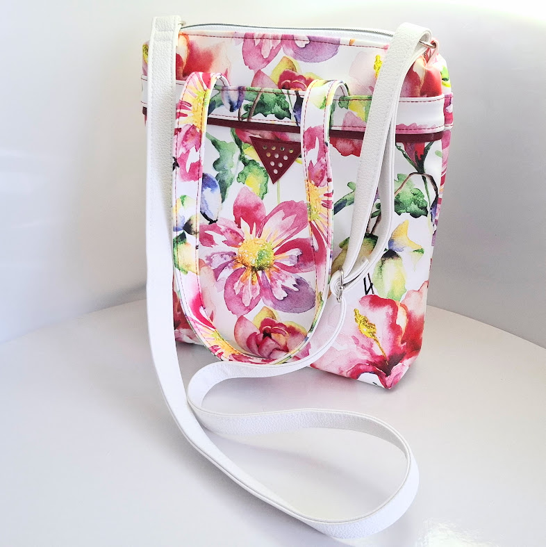 Nošení přes ruku anebo jako crossbody. Výrazný motiv na silné kožence Porto tisk zdobí posuvný popruh v bílé barvě. Ale copak je to za trojúhelník na přední straně? Logo "Kabelky Hes". Trojúhelník s deseti malými dírkami.