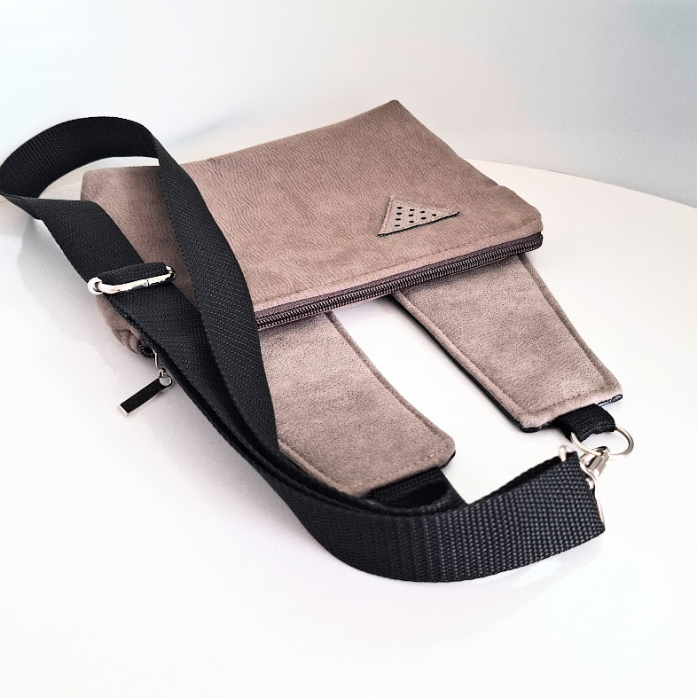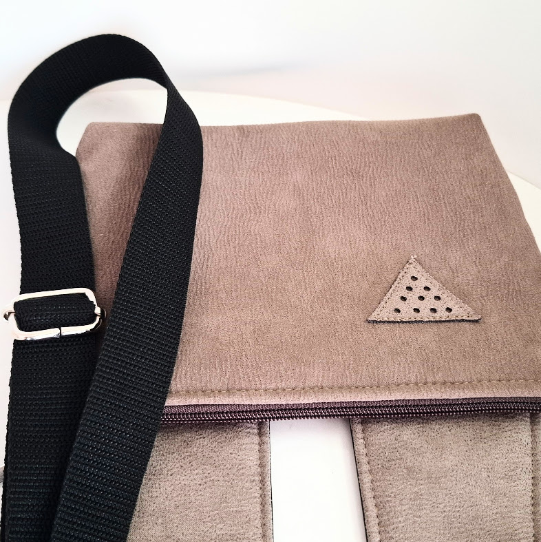Hnědá crossbody materiál broušená bavlna (na omak broušená kůže) plně uzavíratelná na zip. Uvnitř bavlna. Výška 18 cm, šířka 24,5 cm. Délka posuvného ucha 124 cm.