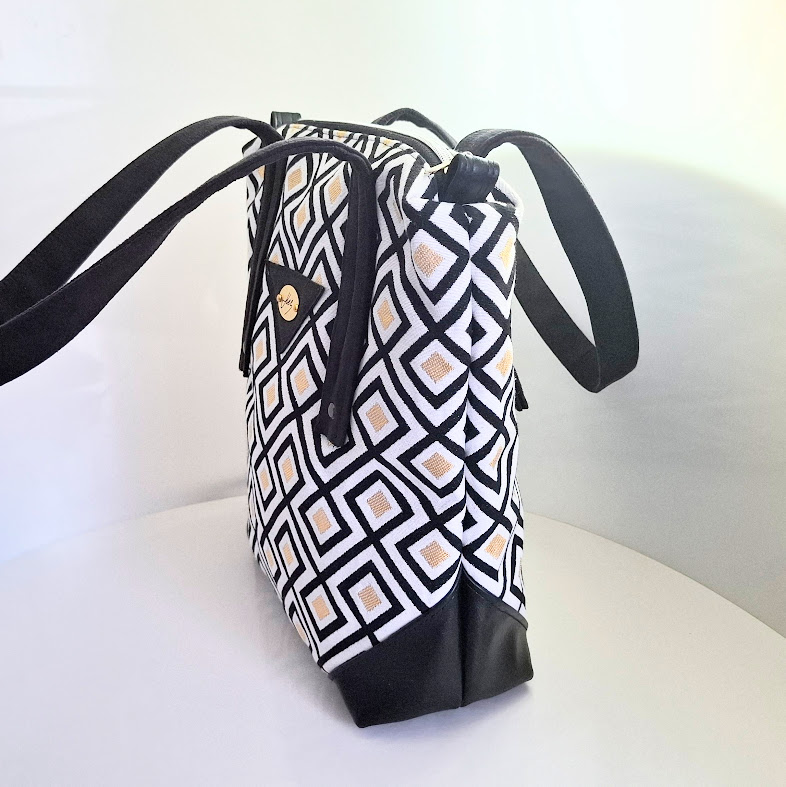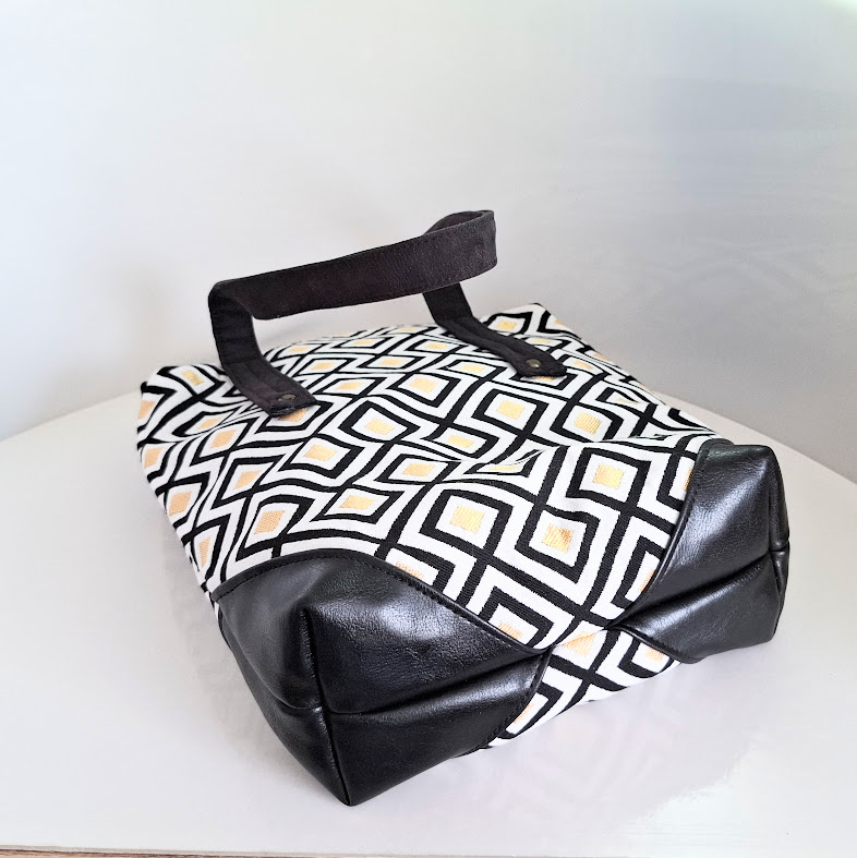 Nošení přes ruku anebo na rameni. Gobelínová látka s geometrickým vzorem se zlatými výšivkami. Elegantní kabelka má dno chráněné v rozích kvalitní koženkou v černé barvě. Ucha kabelky jsou ušita z broušené bavlny. Pokud se vám ucha více zašpiní, broušenou bavlnu můžete šetrně namočit do vody s mýdlovou vodou a vyčistit. Elegantní kabelka je vhodným módním doplňkem k černému oblečení.