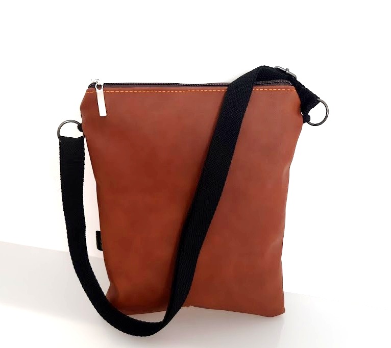 Crossbody materiál tkaná látka, plně uzavíratelná na zip. Zadní část hnědá koženka, uvnitř crossbody bavlna. Výška 25,5 cm, šířka 21 cm. Délka posuvného ucha 117 cm.