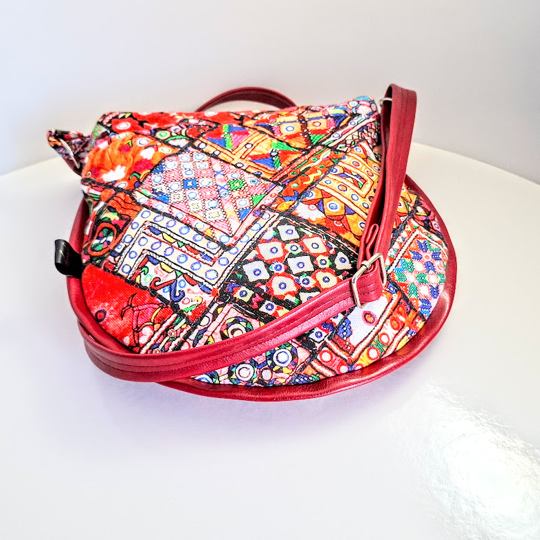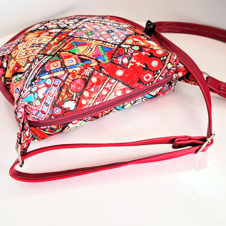 Kabelka materiál 100% bavlna tisk Boho plně uzavíratelná na zip. Ucho temnější červená koženka. Uvnitř červená bavlna, jedna kapsička. Výška 26,5 cm, šířka u hrdla kabelky 25 cm. Délka posuvného ucha 115 cm.