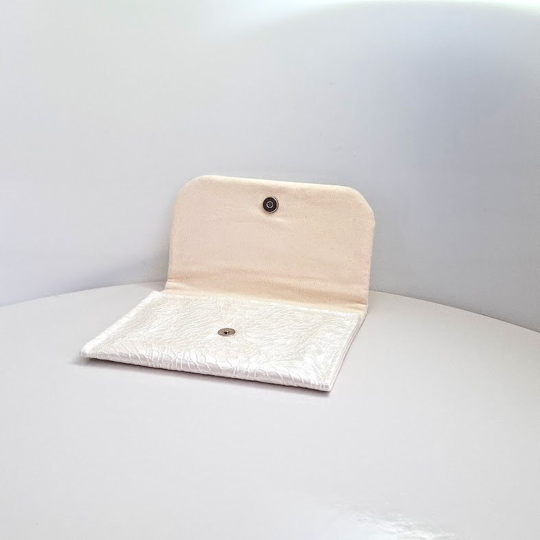 Malé bílé psaníčko materiál perforovaná bílá koženka. Uvnitř světlá bavlna. Magnetické zapínání. Výška 14 cm, šířka 19 cm.