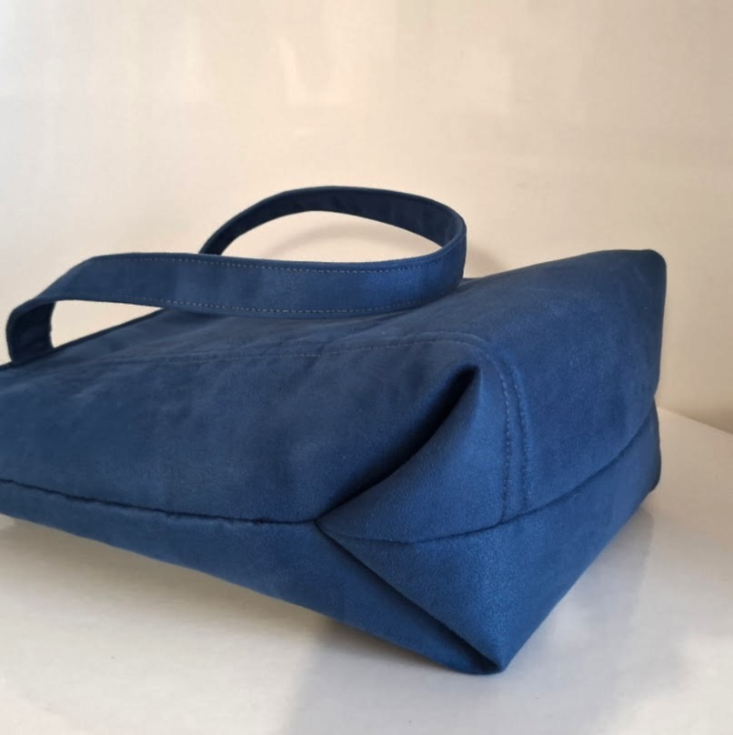 Materiál semiš podložený pěnou. Uvnitř černá bavlna, dvě kapsičky. Dvojí magnetické zapínání. Atypické dno kabelky. Výška kabelky 32 cm, šířka 33 cm.