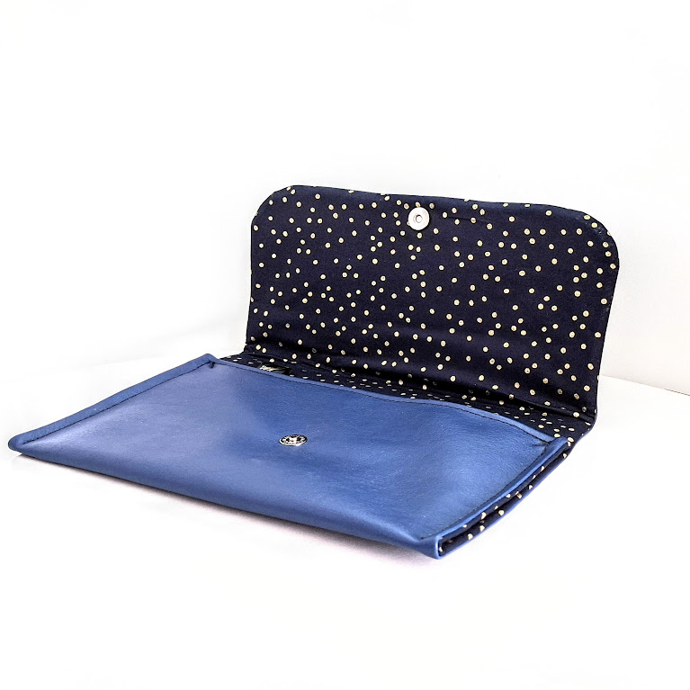 Psaníčko materiál tmavě modrá koženka, uvnitř modrá bavlna se zlatými puntíky. Magnetické zapínání. Výška 17,5 cm, šířka 26 cm.
