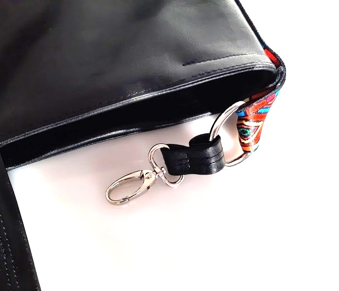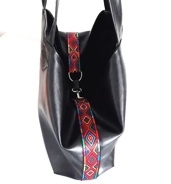 Nošení přes ruku anebo na rameni. Tvar kabelky působí odlišně a elegantně díky všitému pásu barevného popruhu po stranách, který se na koncích zapíná na stříbrnou karabinu. Chcete jít s kabelkou na větší nákup? Ano, po odepnutí karabin se kabela otevře do velkého obdélníku a opravdu hodně se do ní vejde.